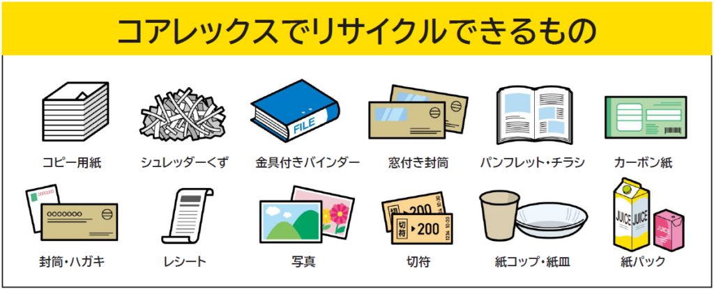 弊社グループ会社のコアレックスグループでは、上記の紙ごみをリサイクルしてトイレットペーパーとして生まれ変わらせる技術を保有しており、CO2の削減とクローズドリサイクルを強く推進しております。